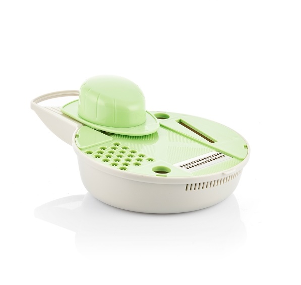 Kompaktni i uklonjivi dizajn pomaže u održavanju reda u kuhinji, optimizira prostor i olakšava čišćenje i skladištenje. Posuda spremnik ima odvod i ergonomsku ručku i zapremine je od 700 ml. Sadrži disk s nekoliko oštrica za izvođenje 4 različite vrste reza (mandolina, ribež za krupno ribanje, ribež i rezač). Poklopac je proziran i ima tanki ribež i dršku. Osim toga, uključuje pribor za zaštitu prstiju za ugodniju, jednostavnu i sigurnu uporabu. Višenamjenski rezač, u drški ima rupu za vješanje po želji.